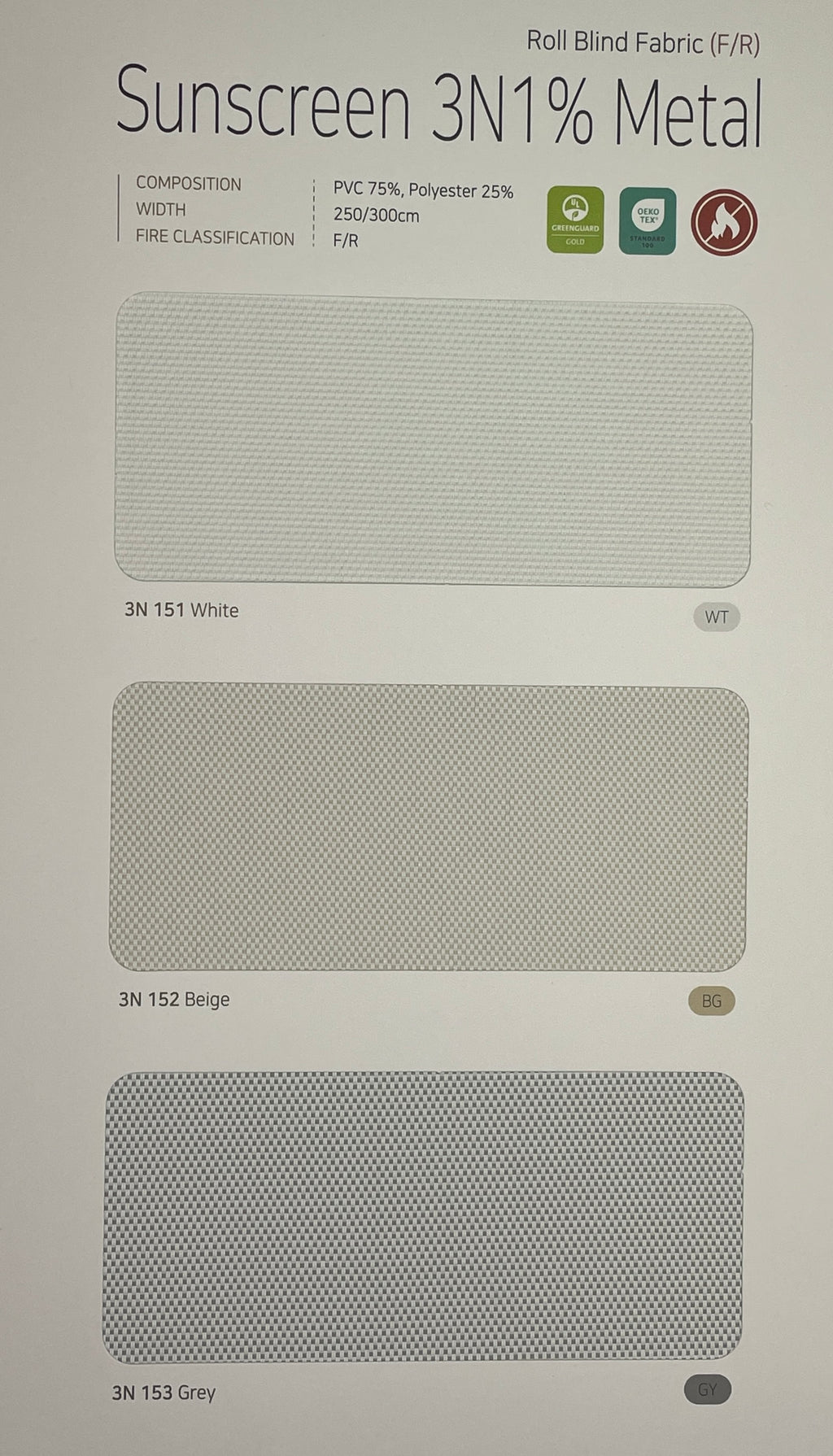 The Sunscreen 3N1% Metal (F/R) collection is a high-performance roller shade system designed to deliver effective glare control, daytime privacy, and fire-retardant protection. With a refined 1% openness factor, this fabric allows minimal light transmission while maintaining clear exterior views—making it ideal for workspaces, hospitality projects, and residential environments that require solar shading with visual connection.