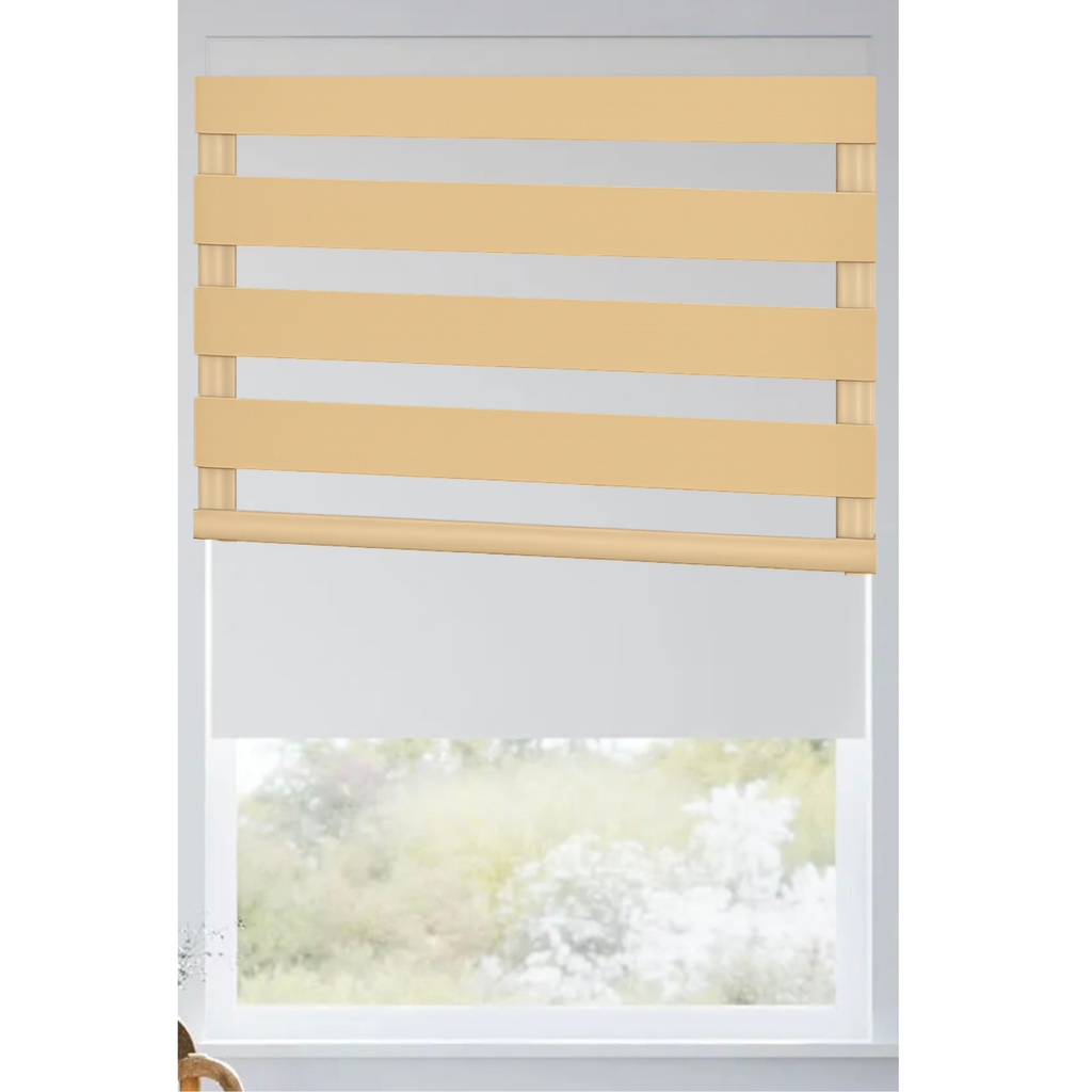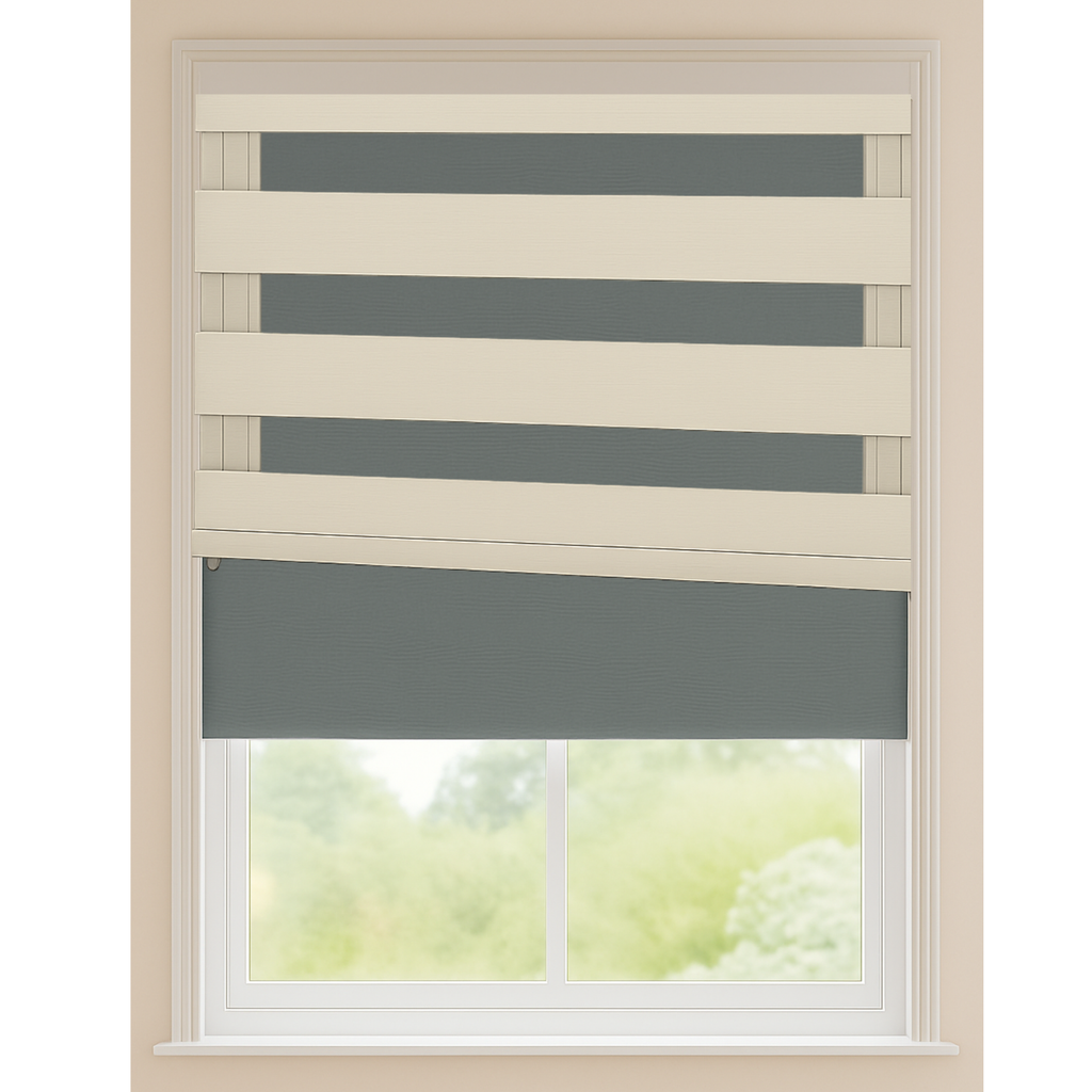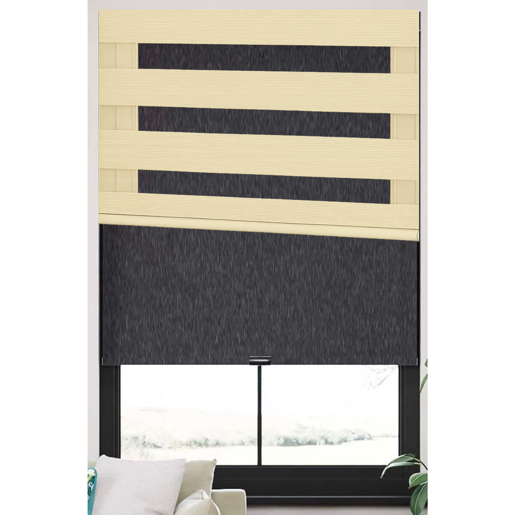 The Visual Blackout Duo introduces a refined twoâshade configuration that enhances both blackout efficiency and modern interior style. At the heart of the system is a full Blackout Roller Shade, the primary layer responsible for delivering total light elimination, maximum privacy, and a clean, uniform appearance. In front of it operates a decorative Blackout Zebra overlay, engineered with one blackout band and one sheer band. This zebra component is not intended to block light on its own; instead, it functions as a sophisticated visual accent that adds contrast, depth, and dimensional layering to the window.