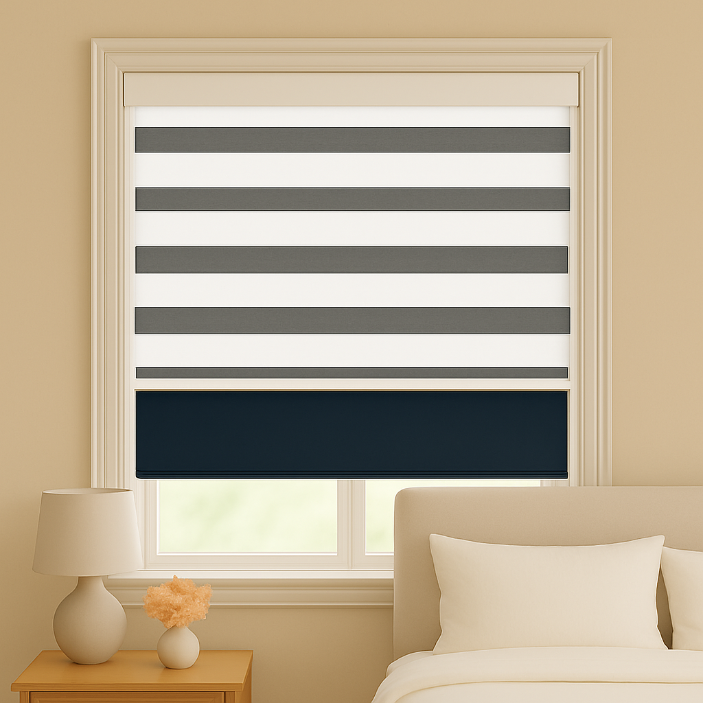 Dual blackout system: Roller Shade (primary blackout) + decorative Zebra Shade